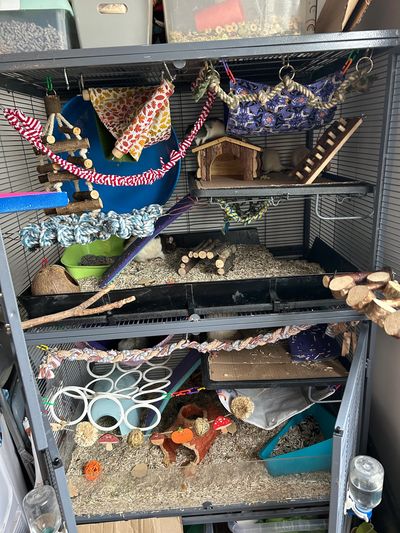 I do hammocks twice a week, spot clean (pick up poo) and change litter trays every 3-4 days and change substrate once a week. When I change the substrate I don’t take it all out I try to change about half to 3/4 of it at a time. This method stops them scent marking to much which leads to them being more smelly which leads to more cleaning and it turns into a vicious cycle. I also wipe down all their houses, wheel bars etc once a fortnight but do that on a day when I don’t do anything other cleaning.